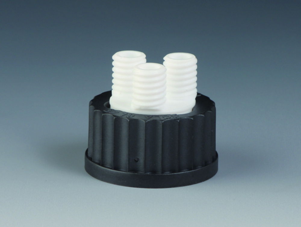 The Bohlender Multiple Distributor for Bottles, PPFE, 3xGL14 is designed for use with GL45 threaded bottles, facilitating efficient liquid decanting. This distributor features three GL14 threaded necks, allowing for connections to liquid sources, excess pressure, or vacuum systems. It's compatible with tubing up to 8.5 mm in diameter and is constructed from high-quality PPFE material for durability and chemical resistance.