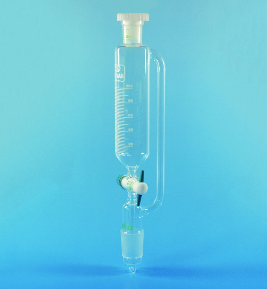 PTFE stopcock, PE stoppers. Cylindrical shape, with pressure equalising tube. ISO 4800 and DIN 12242.
