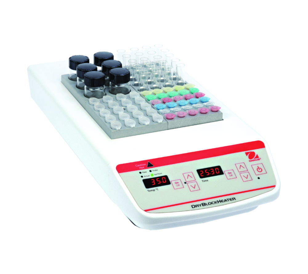 The Ohaus Digital Dry Block Heater with Dual Block Capacity (EU & UK Plugs) is designed for consistent and precise temperature control in laboratory applications. Accommodating two interchangeable modular blocks, it provides exceptional temperature stability for incubation, enzyme reactions, immunoassays, melting/boiling point determination, and a wide variety of other procedures. The microprocessor control ensures accurate settings, while the LED display provides clear readings. An integral support rod holder with locking knob accepts optional external temperature probe kits, and each block includes a thermometer well for measuring block temperature. Efficient heating is achieved through close tube-and-block contact.