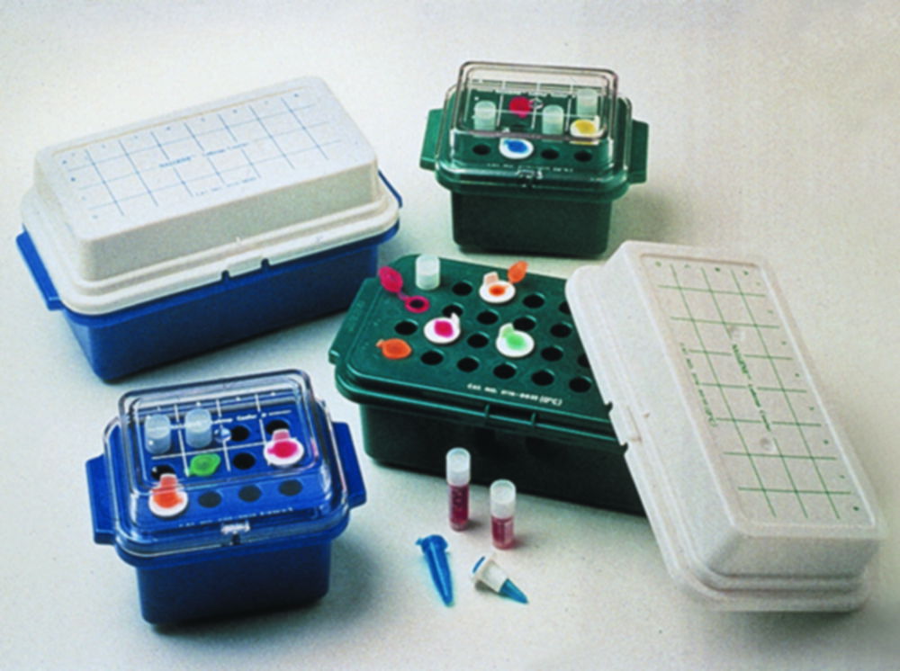 The economical alternative for keeping samples and biochemical reagents cool at the workbench or for protecting against temperature fluctuations and power failure in refrigeration apparatus. With write-on, gridded lid. Lids fit one way to maintain the correct grid orientation. Robust, space-saving and stackable. With non-slip rubber feet. Can be used down to -135°C. Adapters are also supplied for 0.5ml microtubes.