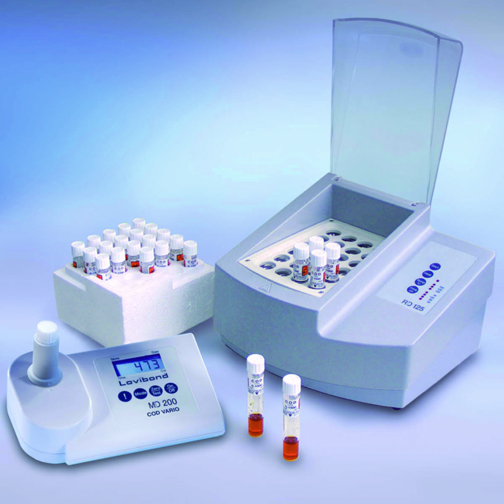According to ISO 15705. This measuring station from Lovibond® allows the accurate, rapid, and economical determination of meaningful waste water COD levels (Chemical Oxygen Demand). Easy operation, even by unskilled operators. Comprises of COD photometer, 25 tube tests covering lower measuring ranges, a reactor block for sample digestion and a tube stand. Waterproof acc. to IP 68, 1 hour at 0.1 meter.