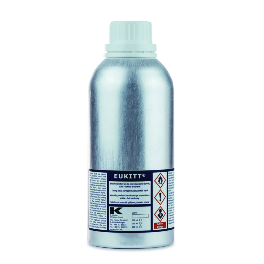 EUKITT®: Gold-standard mounting medium. Particularly preferred for use in coverslippers. EUKITT® resists heat, cold (-17 °C), humidity, daylight and UV light and preserves the original preparations for an unlimited period. Drying time: 20 minutes.