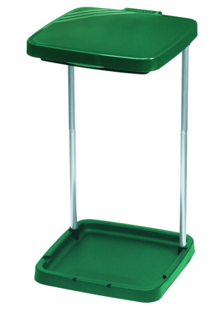 Green. Consists of floor plate and lid with frame made of stable plastic. Assembled with two dismountable metal tubes.