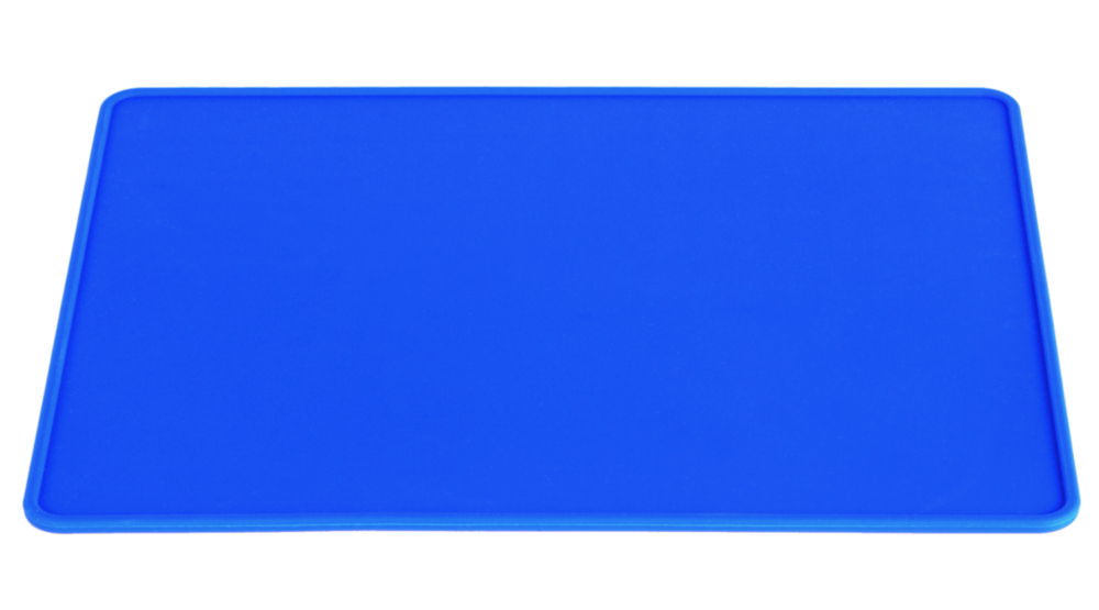 Non-slip Laboratory mats with 2 different sides for organising and thus simplyfying workflow processes. One side with a completely flat surface and one side with a combination of gridded and flat surface. The gridded area avoids unwanted movement of small parts